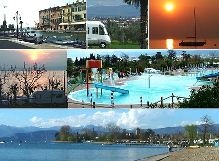 Über die Alpen ins sonnige Italien Oben links der pittoreske Hafen von Lazise, Mitte rechts die Pool-Anlage auf dem Campingplatz "Piani di Clodia", unten der Sandstrand am Campingplatz "Spiaggia d´Oro". (Fotos:Richter)(hr) Als Nahziel mit mildem Mittelmeerklima haben besonders die süddeutschen Camper die oberitalienischen Seen in ihr Herz geschlossen. Der größte von ihnen und gleichzeitig das größte Binnengewässer Italiens ist mit einer Länge von rund 50 Kilometern der Lago di Garda, im deutschen Sprachraum als "Gardasee" bekannt. Im Süden, am Übergang von den Ausläufern der Alpen in die Po-Ebene, ist er bis zu 17 Kilometer breit. Dort befindet sich am Ostufer zwischen Lazise und Peschiera auch eines der Zentren des Campingtourismus am Lago di Garda. Allein die ersten sechs Campingplätze südlich von Lazise bieten rund 4.200 Stellplätze. Vier von ihnen ("Du Parc", "Spiaggia d´Oro", "La Quercia" und "Ideal") liegen so nah am historischen Stadtkern von Lazise, dass der allabendliche Bummel ins beschauliche Skaliger-Städtchen am Strand entlang fast ein Muss ist.