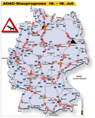 ADAC-Stauprognose für das Wochenende 16. - 18. Juli (Quelle:ADAC)(hr) (adac) Lange Fahrzeugschlangen prägen jetzt zunehmend das Bild auf den deutschen Ferienautobahnen. Am kommenden Wochenende beginnen in Hessen, Rheinland-Pfalz und im Saarland die Ferien. Dazu gesellt sich eine zweite Reisewelle in Richtung Süden aus Bremen, Niedersachsen, Sachsen-Anhalt, Sachsen und Thüringen. Schließlich werden auch Autofahrer aus den Niederlanden maßgeblich zum Kolonnenverkehr beitragen. Betroffen vom Stop-and-go-Verkehr sind laut ADAC vor allem folgende Autobahnen: