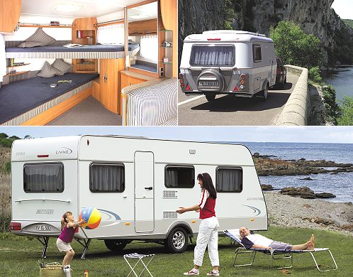 Eriba-Caravans mit zwei erneuerten Baureihen Unten der neue "Eriba-Living". Oben links ein Blick in den "Nova 680" mit innovativem Grundriss, daneben der facegeliftete "Touring". (Fotos:Hymer)(hr) "Eriba-Living" heißt künftig die Wohnwagen-Einstiegsklasse von Hymer. Die neue Baureihe löst mit 12 Grundrissen in der Saison 2004/2005 den "Eriba-Swing" ab und zielt mit einem attraktiven Preis-Leistungsverhältnis und modernem Design auf junge Familien.