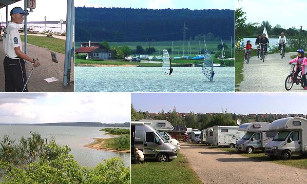 Stauseen sind die Touristenmagneten in Franken Nordic Walking, Windsurfen und Radfahren gehören zu den beliebtesten Aktivitäten an der Fränkischen Seenplatte. Unten der Reisemobil-Stellplatz in Absberg. (Fotos:Richter)(hr) Ein wahres Dorado für aktive Camper und Reisemobilisten ist das Fränkische Seenland südlich von Nürnberg. Dort entstanden ab Mitte der 70er Jahre mehrere Stauseen, die heute als Touristenmagneten der ländlichen Region Zusatzeinkünfte bescheren. Radler und Wanderer tummeln sich auf den Wegen rund um die Seen, und auch der Nordic-Walking-Trend hat dort Einzug gehalten. Es gibt zahlreiche Badestrände für Wasserratten. Daneben kommen die segelnden und surfenden Wassersportler auf ihre Kosten. Auf einem großen Fahrgast-Trimaran lässt sich der Große Brombachsee per Rundfahrt vom Wasser aus genießen.