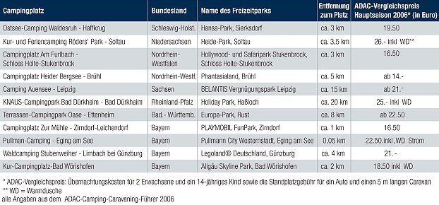 Wer beispielsweise in den Norden der Republik reist, um den Heide-Park in Soltau kennen zu lernen, kann auf dem nur dreieinhalb Kilometer entfernten Kur- und Feriencamping Röders Park günstig übernachten. Hier zahlen zwei Erwachsene mit einem 14-jährigen Kind für eine Übernachtung mit Auto und Standplatzgebühr für einen Caravan (ADAC-Vergleichspreis) in der Hauptsaison 26 Euro. In der Standplatzgestaltung wartet der Campingplatz mit fünf und im Sanitärbereich mit immerhin vier Sternen auf.