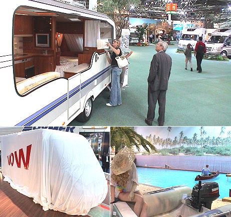 Morgen öffnet in Düsseldorf der Caravan Salon Wohnwagen und Wohnmobile von außen und innen betrachten kann man in Düsseldorf nach Lust und Laune. Ob jede Neuheit ein "Wow"-Erlebnis auslöst (unten links), wird sich ab morgen zeigen. Unten rechts ein Blick in die Sonderschau "Caravaning Wassersport". (Fotos:Richter)(hr) Erneut gewachsen ist in diesem Jahr der Caravan Salon in Düsseldorf, die europäische Leitmesse der Caravaningbranche. Ab morgen, 26. August, bis Sonntag 3. September, werden auf dem Düsseldorfer Messegelände auf rund 200.000 Quadratmetern mehr als 2.000 Freizeitfahrzeuge gezeigt. Neben den Caravans und Reisemobilen gibt es alles zu sehen, was den aktiven Camper interessiert: Fahrzeugtechnik, Zubehör, Dienstleistungen und Reiseziele. Erstmals belegt der Caravan Salon in Düsseldorf elf Messehallen. So ist jetzt der Touristikbereich in einer eigenen Halle untergebracht, wo es Informationen zu rund 750 Campingplätzen und 500 Stellplätzen gibt. Im vergangenen Jahr kamen 164.000 Besucher an den Rhein, und die Messeveranstalter sind zuversichtlich, diese Zahl auch diesmal wieder zu erreichen.