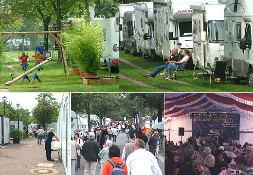 Hier treffen sich Wohnmobilisten und Wohnwagenfahrer aus aller Welt. Für viele Gäste gehört es schon zur Jahresplanung, den Besuch der Messe mit einem Aufenthalt beim Caravan-Center zu verbinden. Die Stimmung hier kann man nicht beschreiben, man muss sie einfach erlebt haben. In Reih´ und Glied, stehen die verschiedenartigsten Wohnmobile oder Wohnwagen, vor den Fahrzeugen sitzt man gemütlich bei einem Kaffee oder Bier, bestaunt die vorbeiziehenden Neuankömmlinge und genießt die Atmosphäre unter Gleichgesinnten. Mit den Nachbarn tauscht man Stellplatztipps aus oder diskutiert über Vor- und Nachteile der eigenen Fahrzeuge. Der Fluglärm des in der Nähe gelegenen Düsseldorfer Flughafens gehört irgendwie dazu, die Starts und Landungen der riesigen Flugzeuge dienen schon fast der Unterhaltung. Wobei für Unterhaltung auf dem Caravan-Center gesorgt ist. Jeden Abend spielt eine Liveband im Festzelt, wo man auch zu akzeptablen Preisen täglich von 18 Uhr bis 23 Uhr einen Imbiss erhält. Für die Versorgung mit Brötchen, einigen Frischwaren, Kaffee oder ähnlichem sind Kioske von 7 bis 20.30 Uhr geöffnet. Toiletten und Duschräume stehen den Gästen rund um die Uhr zur Verfügung. Ver- und Entsorgung ist zwischen 8 Uhr und 21 Uhr kostenlos möglich. Ein Shuttle-Service sorgt für den Transport vom Caravan-Center in Düsseldorfs Innenstadt oder zur Messe. Das Konzept der Veranstalter scheint anzukommen: Rundumversorgung, freundliches Personal und viel Sehenswertes. Rund 2.000 Stellplätze stehen zur Verfügung, viele davon mit Stromanschluss. Die Besucher fühlen sich hier wohl, der Besuch der Messe scheint bei einigen sogar nur ein guter Nebeneffekt zu sein. Teilweise erzählen Gäste, dass sie eine ganze Woche auf dem Gelände bleiben, obwohl die versorgten Plätze 20 Euro pro Nacht kosten. Zahlreiche Freundschaften wurden hier schon geschlossen, und es ist klar: Man trifft sich im nächsten Jahr wieder in Düsseldorf auf dem Caravan-Center.