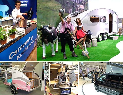 In Düsseldorf dreht sich wieder alles um Camping und Caravaning Links oben Fernsehkoch Martin Baudrexel im "Caravaning Kochstudio". Die Palette der Freizeitfahrzeuge reicht vom. Mini-Wohnwagen aus der Türkei (u.l.) bis zum Luxusmobil, in dessen Anhänger sogar ein Hubschrauber mitgenommen werden kann (u.Mitte). (Fotos:Richter)(hr) In Düsseldorf wird morgen im Beisein von Bundesverkehrsminister Wolfgang Tiefensee der 47. Caravan Salon eröffnet. Auf der wichtigsten alljährlichen Messe für die Camping- und Caravaningbranche gaben sich bereits heute Fachbesucher und Medienvertreter ein Stelldichein.