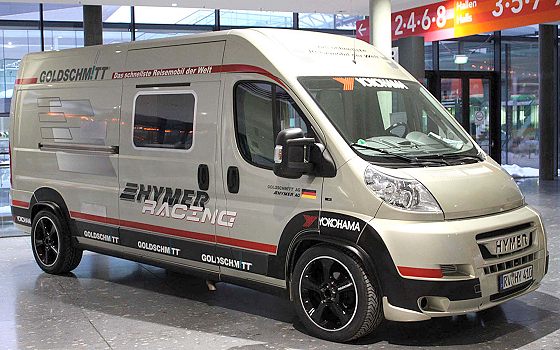 Guinness-Rekordfahrt mit angestrebten 230 km/h im Frühjahr (Foto: Hymer)(red) Ein von Goldschmitt veredelter HYMER Car ist, so wie es aussieht, das schnellste Reisemobil der Welt. Bei einer Rekordfahrt vor der Stuttgarter Urlaubs- und Freizeitmesse CMT übertrumpfte das mit einem sparsamen 2,3-Liter-Motor samt Gas-Diesel-Antrieb ausgestattete Wohnmobil die bisherige Bestmarke von 191 km/h deutlich. Sogar die 200 km/h, der Wert, den solch ein Fahrzeug erreichen muss, um sich im Sinne des Guinness-Buchs der Rekorde als schnellstes Reisemobil der Welt bezeichnen zu dürfen, übertrumpfte das Fahrzeug schon in einem ersten Versuch auf einem Flugplatzgelände. 207 km/h zeigte die Geschwindigkeitsmessung. Das Fahrzeug wird während der CMT (16. bis 24. Januar 2010) im Foyer der Neuen Landesmesse Stuttgart zu sehen sein.Â
