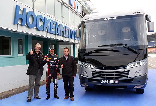 Weltmeister Markus Winkelhock lobt Goldschmitt-HP-Technologie (Foto: Goldschmitt techmobil AG)(red) (gpm) Mit solch einem Gefährt war Rennfahrer Markus Winkelhock noch nie zu vor auf dem Hockenheimring unterwegs gewesen: Wenige Tage nach dem Gewinn der FIA-GT1-Weltmeisterschaft testete der Champion auf der nordbadischen Rennstrecke ein stattliches Dethleffs-Reisemobil, das mit dem neuartigen hydropneumatischen (HP-) Fahrwerk von Goldschmitt ausgestattet war. Nach mehreren rasanten Runden zeigte sich Markus Winkelhock voll des Lobes über die Fahrwerkstechnik aus dem Odenwald: „Es ist unglaublich, wie das riesige Fahrzeug auf der Straße liegt. Das hätte ich nicht für möglich gehalten.“