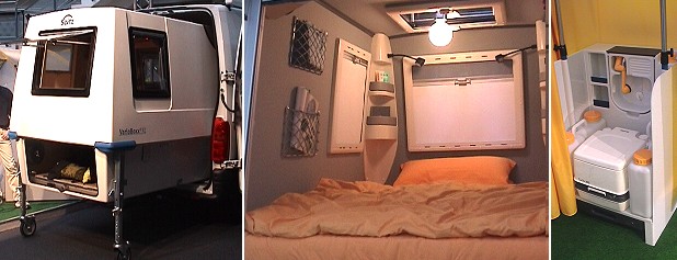 Pfiffige Kabine für den spontanen Campingtrip (Fotos:Richter)(hr) Eugen Seitz, in der Caravaning-Branche bestens bekannter Tüftler und Erfinder aus dem Schwabenland, sorgt für eines der Highlights in diesem Jahr auf der Messe "Caravan, Motor, Touristik" (CMT) in Stuttgart. Gleich am Messeeingang Süd präsentiert er als Neuentwicklung des Hauses Seitz die "VarioBoxx", eine mobile Schlafkabine für Leute und junge Familien, die als Alltagsauto einen Van oder Kleinbus besitzen und ab und zu auf Campingtour gehen wollen. Hierzu wird die "VarioBoxx" ganz einfach in den Laderaum des Autos gepackt. Am Übernachtungsplatz kann sie dann teilweise oder ganz aus dem Auto herausgezogen werden. Die Kabine kann auch auf eigenen Füßen stehen bleiben, wenn man mit dem Auto vom Campingplatz aus auf Tour gehen will. Ergänzend zur "VarioBoxx" hat Seitz eine ganze Produktfamilie entwickelt: Mit dem "VarioZelt" kann man im Anschluss an die Schlaf-Box auf großem Raum eine Wohnwelt zaubern mit zusätzlichen Innenzelten und viel Abstellplatz, die "K-Boxx" ist eine kompakte und frei aufstellbare Küche mit allem drum und dran, und die "T-Boxx" ist eine autarke Sanitärstation mit Chemietoilette, Wasch- und Duschmöglichkeit. Beide Zusatzboxen können im Stauraum der "VarioBoxx" untergebracht werden. Auch auf Elektrizität und moderne Technik bis hin zum Flachbildschirm für Sat-Fernsehen müssen "VarioBoxx"-Camper nicht verzichten. Übrigens lässt sich die pfiffige Campingkabine auch auf einem normalen Anhänger oder der Ladepritsche eines Pick-Ups mitnehmen. Und wer sie ganzjährig nutzen möchte, kann zuhause auch seine Fahrräder darin unterstellen.