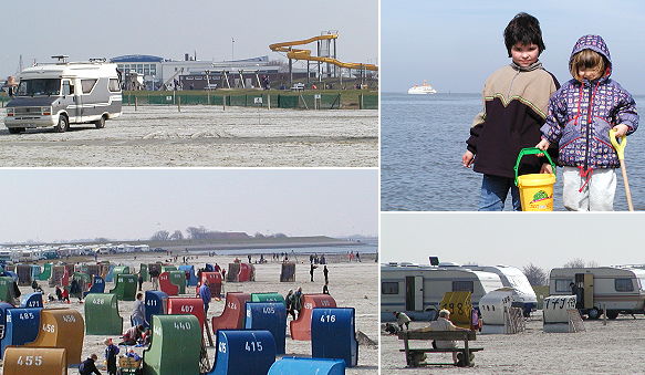 Familiencampingplatz direkt am Strand mit Strandkorb vor der „Haustür“ Impressionen, festgehalten auf und um den Campingplatz in Bensersiel/Nordsee (Fotos:Claussen)(jc) Direkt am Strand, vor dem Deich gelegene Campingplätze an der Nordsee sind traumhaft, bieten aber auch kleine Komfortnachteile, denn sie müssen oftmals nach der Saison komplett abgebaut werden. Die Einrichtungen sind deshalb mehr oder weniger provisorisch anmutende Container oder Leichtbauhallen für Sanitäreinrichtungen, Restaurant oder Lebensmittelverkauf. Dies ist auch auf dem Familien- und Kurcampingplatz des Nordseeheilbads Esens im Ortsteil Bensersiel nicht anders. Allerdings bietet dieser Platz eine unmittelbar angrenzende, ideale Infrastruktur für den Familienaufenthalt in Ostfriesland. Neben dem Blick auf die vorgelagerten Ostfriesische Inseln und den direkt vom Stellplatz zu startenden Wattwanderungen gibt es ans Platzgelände angrenzendes Meerwasser-Wellenfreibad (geöffnet ab Mai) und in ein in wenigen Gehminuten zu erreichendes Erlebnisbad, die Nordseetherme „Sonneninsel“. Ein angrenzender maritimer Sport Themen Park, unter anderem mit Skaterfläche inklusive Halfpipe, Courts für Tennis, Beach-Volleyball, Soccer, Basketball und einem großzügig angelegten Abenteuerspielplatz sind nur einige Highlights einer Freizeit-Konzeption, die man als vorbildlich bezeichnen kann. Im ebenfalls an das Campinggelände angrenzenden Fischer- und Fährhafen lässt sich fangfrischer Fisch oder das Ticket für den Trip zu einer der greifbar nah erscheinenden Inseln erstehen.