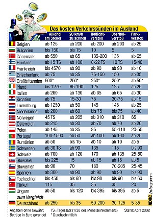 Verkehrssünden im Ausland - Euro sorgt für mehr Transparenz (Quelle:ADAC)(hr) (adac) Die Einführung des Euro in zwölf europäischen Ländern hat auch für Verkehrssünder mehr Transparenz gebracht. Dabei wird deutlich, dass relativ viele Verkehrsverstöße in Deutschland milder bestraft werden als in unseren Nachbarländern. Wie die aktuelle ADAC-Tabelle zeigt, können Geldbußen die Urlaubskasse ganz schön belasten.
