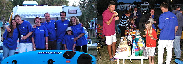 Guter (Mode)-Geschmack bescherte traditionellem Grillabend neuen Namen (Fotos:Claussen)(jc) Bereits seit einigen Jahren trifft sich eine inzwischen auf rund 25 Personen angewachsene Gruppe von Freunden des Camping-Channels regelmäßig in den Pfingstferien auf Sardinien, um im Nordwesten der Mittelmeerinsel gemeinsam ihren Hobbies Campen und Windsurfen zu frönen. Die Freunde, die gemeinsam durch dick und dünn gehen und aus dem gesamten süddeutschen Raum zusammenkommen, sind natürlich fast allesamt Besitzer des inzwischen Kultstatus genießenden blauen T-Shirts des Internet-Portals. So kamen beim traditionellen "Rosmarin-Kartoffelabend" der Gruppe spontan so viele gleichbekleidete Personen zusammen, dass man kurzerhand einen Camping-Channel-Abend daraus werden ließ. Da wurde dann auch schon mal von gesponserten Camping-Channel-Segeln und Surfboards für das "Camping-Channel-Windsurfteam" geträumt.
